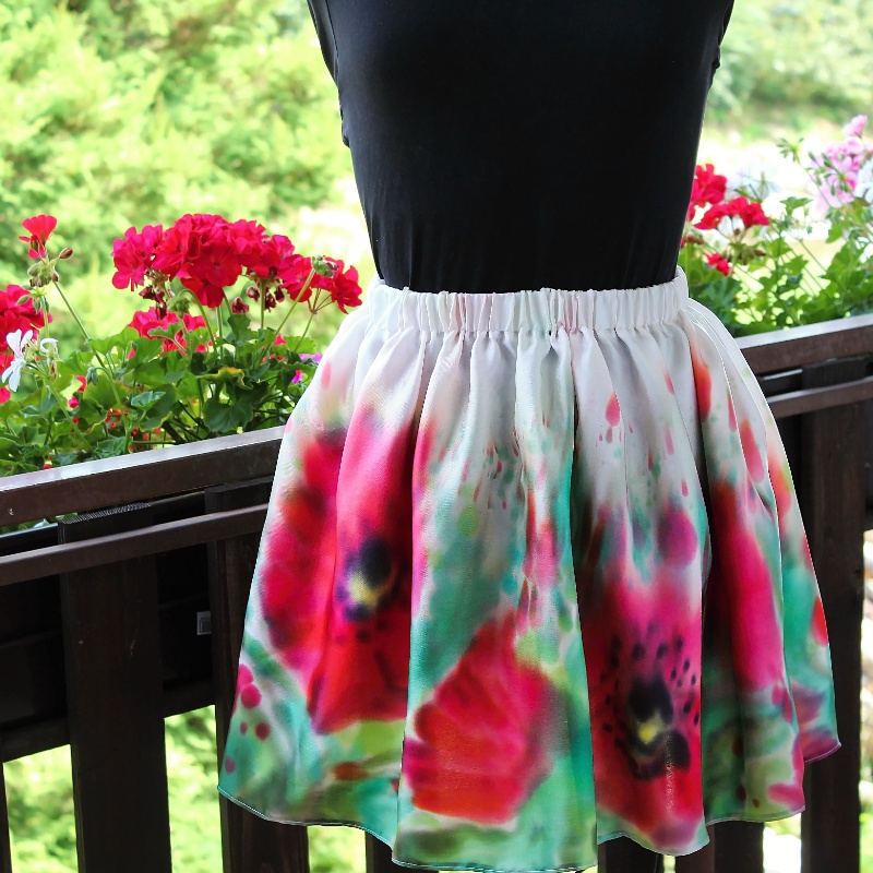 Originální autorská hedvábná ručně malovaná sukně ve velikosti cca 36 - 40. Celková délka včetně pružného pasu 46 cm, obvod 220 cm. Sukně je jednovrstvá bez podšívky, z hedvábného twillu, tedy neprůsvitná. Jedná se o hedvábí s vyšší gramáží tkané keprovou vazbou, vytvářející charakteristické šikmé řádky. Materiál je při běžném použití velmi odolný.V pásku je široká guma. Obvod pružného pasu je v nenataženém stavu 72 cm, maximálně lze natáhnout na 130 cm. Výška pásku je 3 cm.
