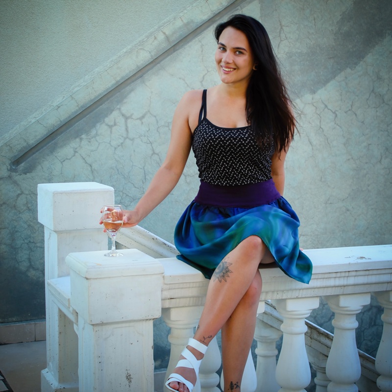 Barvy: profesionální s parní fixací pro zachování hebkosti a lesku hedvábí v barvách připomínajících měňavý taft, v horní části převládá fialová, ve spodní části petrolejová s olivovou. Barvy jsou ve skutečnosti sytější a zářivější, než na titulní fotografii. Náplet je v barvě fialové. Sukni lze použít i jako společenskou, pro tuto příležitost je možné ušít také na míru do pevného pásku z hedvábí barveného stejně jako sukně, se zipem, za příplatek 300,- Kč.