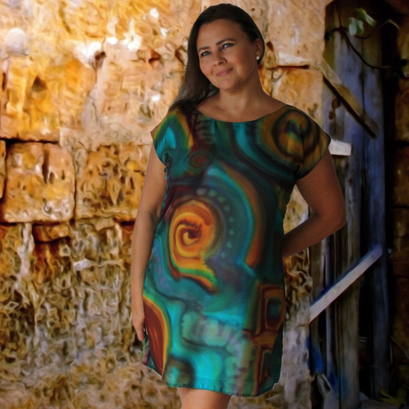 Mírně prohloubený lodičkový výstřih, volný střih, který skryje všechny nedostatky. Šaty jsou ze dvou vrstev hedvábí, spodní vrstva nebarvená. Střih je jednoduchý obdélník bez záševků, bez bočního zipu, pouze mírně zúžený v pase, proto lze nosit i jako tuniku. Díky dvojité vrstvě hedvábí jsou prakticky neprůsvitné, lehké, vzdušné, na těle velmi příjemné. Ideální na letní dovolenou, vzhledem ke své několikagramové hmotnosti velmi praktické na přibalení do kufru do letadla :-)