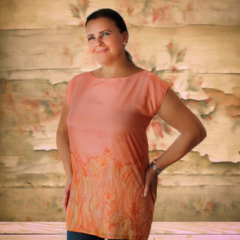 Mírně prohloubený lodičkový výstřih, volný střih, který skryje všechny nedostatky. Tunika je ušita ze dvou vrstev hedvábí, podšívka je nebarvená. Bez záševků, bez bočního zipu. Doplněna úzkým páskem ze stejného materiálu. Titulní fotka je focena na vel. cca 36, v doplňkových fotografiích na ukázku také na vel. cca 44. Díky druhé vrstvě hedvábí je tunika téměř neprůsvitná. Lehká, vzdušná, na těle velmi příjemná.