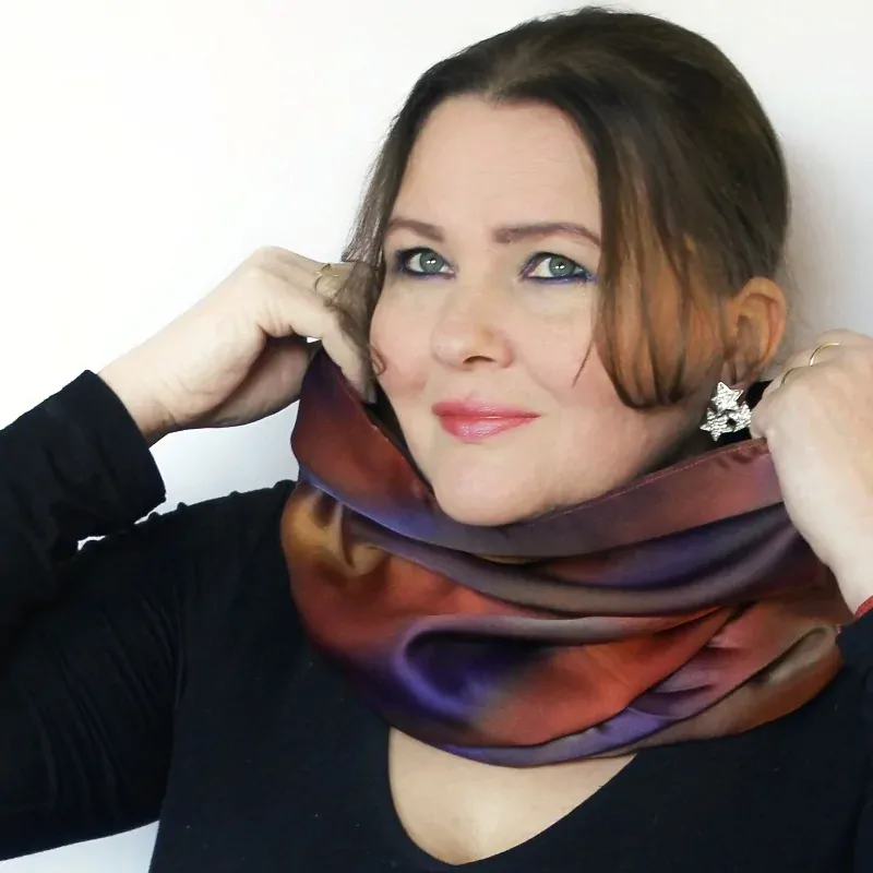 Ručně malovaný originální autorský hedvábný tunel o rozměrech 70 cm obvod a 90 cm délka. Stačí navléknout na krk a jít :-). Nošení je pohodlné, nemůže sklouznout z krku. Jeho použití je variabilní. Je možné nechat po délce celý shrnutý, nebo třeba přeložit napůl, čímž je vizuálně méně objemný, použít ho jako kapuci, nebo třeba jen tak přeložit okolo krku do kabátu.