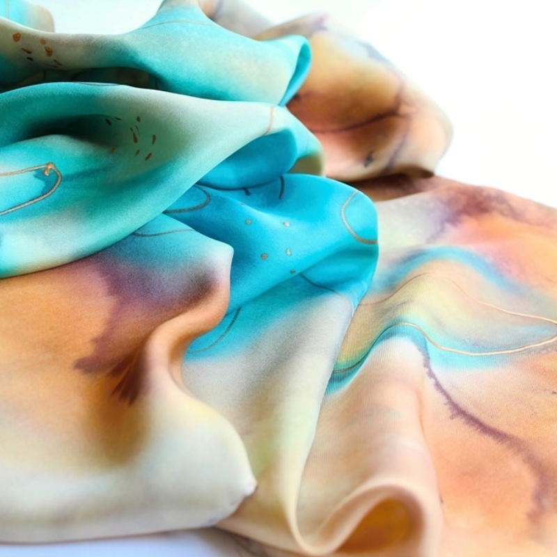 Ručně malovaný originální autorský hedvábný šátek o rozměrech 90x90 cm
