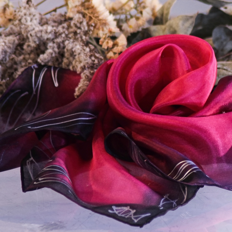 Barvy: profesionální s parní fixací pro zachování hebkosti a lesku hedvábí v odstínech cyklámenově růžovéa černé, doplněno stříbrnou konturou