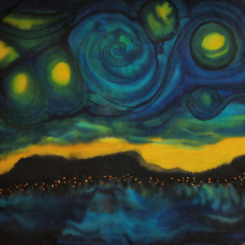 Barvy: profesionální s parní fixací pro zachování hebkosti a lesku hedvábí v odstínech tmavě modré, tyrkysové, žluté a černé, motiv nebe a moře. Jemně dozdobeno zlatou a měděnou konturou
