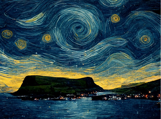 Předlohou pro tento šátek byl obrázek vytvořený umělou inteligencí - Jak by van Gogh namaloval Faerské ostrovy