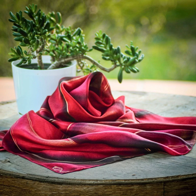 Barvy: profesionální s parní fixací pro zachování hebkosti a lesku hedvábí v odstínech červené a hnědé, s měděnou konturou.
