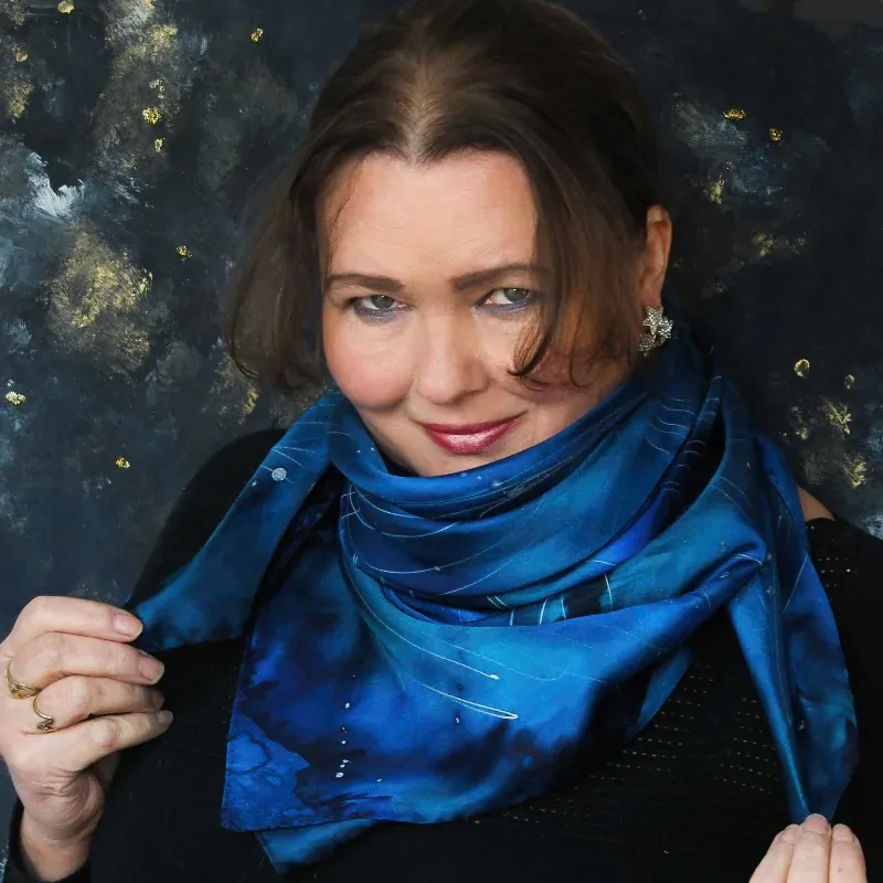 Barvy: profesionální s parní fixací pro zachování hebkosti a lesku hedvábí v různých odstínech tmavě modré a petrolejové, s motivem hvězdné noční oblohy, doplněno stříbrnou konturou