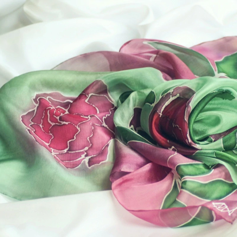 Barvy: profesionální s parní fixací pro zachování hebkosti a lesku hedvábí v odstínech růžové, světle starorůžové a zelené s motivem květů a listů pivoňky. Kresba voskem.