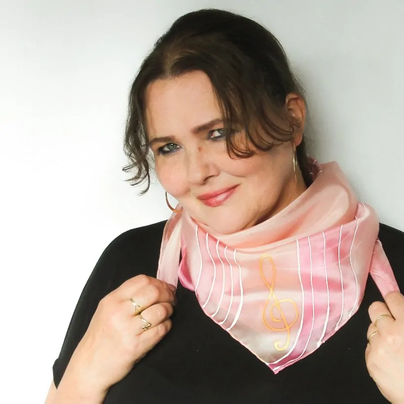 Barvy: profesionální s parní fixací pro zachování hebkosti a lesku hedvábí v pastelových odstínech pudrové, růžové, lososové s pudrovým středem šátku, na okrajích motiv notové osnovy, not a houslového klíče bílou a zlatou konturou