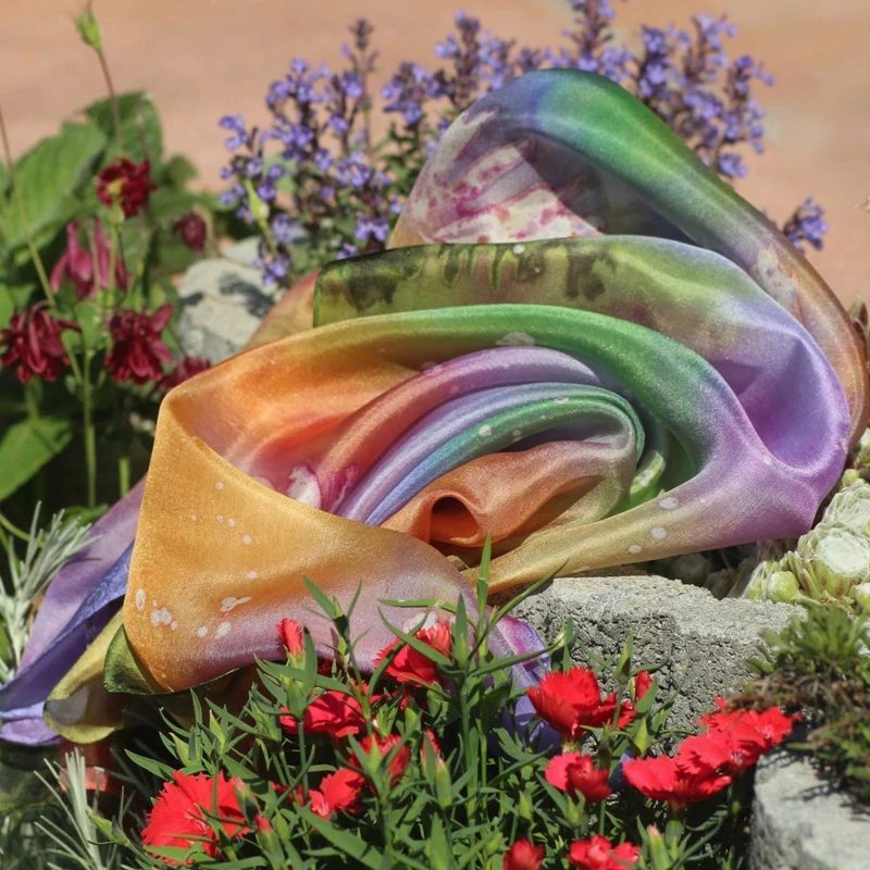 Ručně malovaný originální autorský hedvábný šátek o rozměrech 90x90 cm. Materiál je silnější a kvalitnější, než u většiny ostatních šátků - Ponge 6.