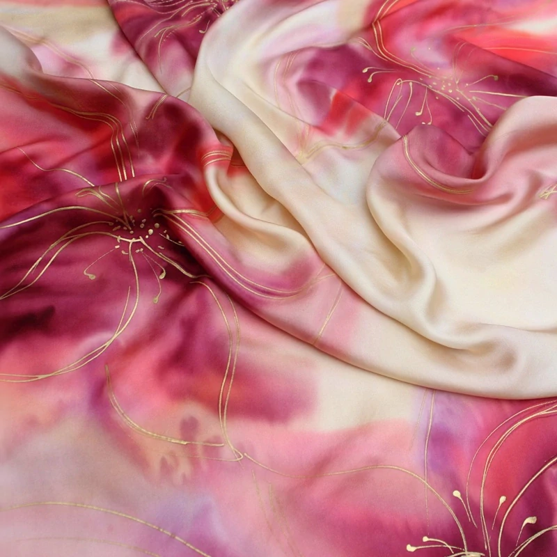Barvy: profesionální s parní fixací pro zachování hebkosti a lesku hedvábí v barvě krémové (základ šátku) s malbou květů v odstínech rubínové, bordo a růžové, doplněno zlatou konturou