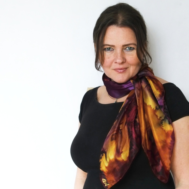Ručně malovaný originální autorský hedvábný šátek o rozměrech 90x90 cm. Materiál je silnější a kvalitnější, než u většiny ostatních šátků - Ponge 6.