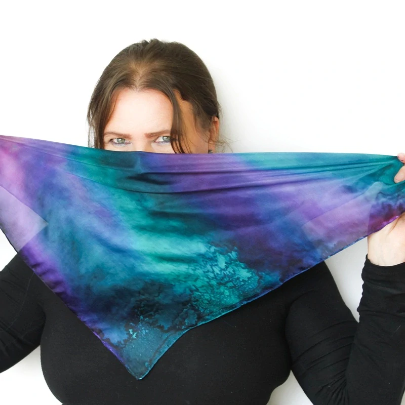 Ručně malovaný originální autorský hedvábný šátek o rozměrech 55x55 cm, vhodný pro uvázání ve stylu "letuška".