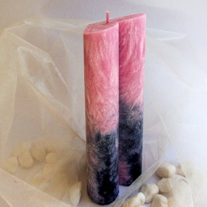 Růžová barva je symbolem bezpodmínečné lásky, přispívá ke schopnosti otevření srdce. Společně se zelenou barvou, která symbolizuje soucítění, je růžová barvou 4. - srdeční čakry. Černá barva je velmi mocná, ochranné působení svíce v této barvě je jedno z nejsilnějších. Odebírá a pohlcuje vše negativní a zlé. Svíce v této barevné kombinaci má nepopsatelný účinek.