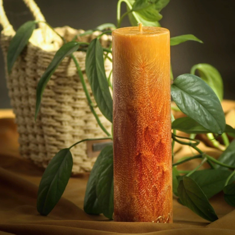 Svíčka ve tvaru válce bez špičky, výška 22 cm, průměr 6,5 cm, hmotnost 670 g, doba hoření cca 80-100 hodin. Barva žlutá s hnědým a oranžovým probarvením.