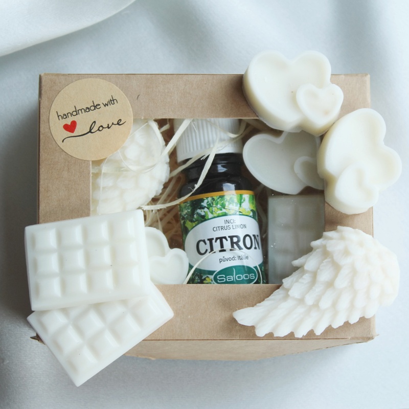 Dárkový balíček ručně odlévaných vosků do aromalampy ve tvaru křídla, dvou srdcí a tabulek čokolády z přírodního sójového vosku bez parfemace, doplněný o lahvičku 100% přírodního esenciálního oleje Citron od firmy Saloos. Baleno v papírové krabičce s průhledem, v přírodní barvě, s dřevitou vlnou.