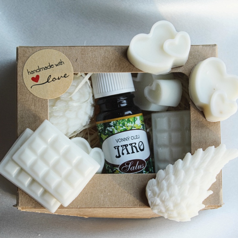 Dárkový balíček ručně odlévaných vosků do aromalampy ve tvaru křídla, dvou srdcí a tabulek čokolády z přírodního sójového vosku bez parfemace, doplněný o lahvičku vonného oleje Jaro od firmy Saloos. Baleno v papírové krabičce s průhledem, v přírodní barvě, s dřevitou vlnou.