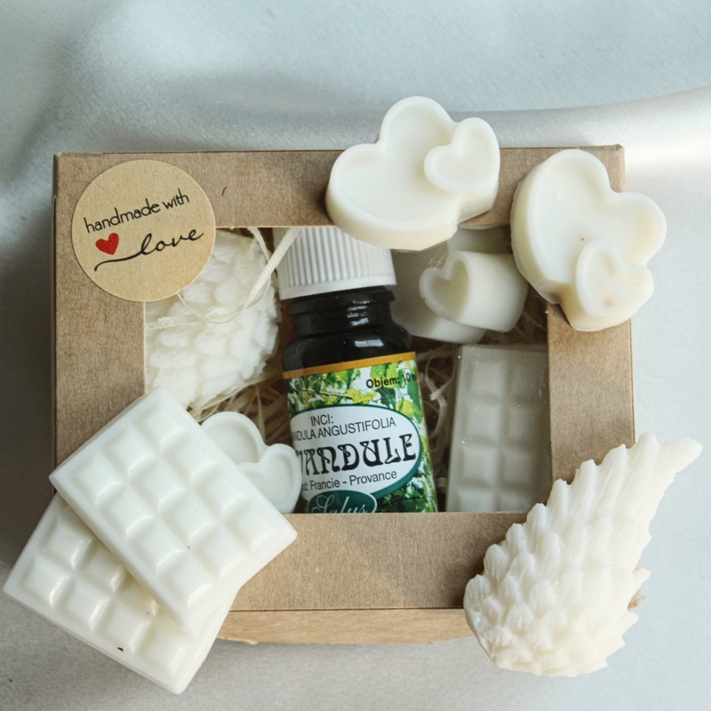 Dárkový balíček ručně odlévaných vosků do aromalampy ve tvaru křídla, dvou srdcí a tabulek čokolády z přírodního sójového vosku bez parfemace, doplněný o lahvičku 100% přírodního esenciálního oleje Levandule od firmy Saloos. Baleno v papírové krabičce s průhledem, v přírodní barvě, s dřevitou vlnou.