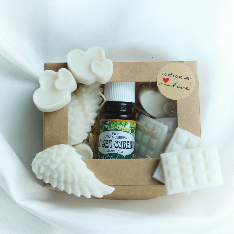 Dárkový balíček ručně odlévaných vosků do aromalampy ve tvaru křídla, dvou srdcí a tabulek čokolády z přírodního sójového vosku bez parfemace, doplněný o lahvičku 100% přírodního esenciálního oleje Litsea cubeba od firmy Saloos. Baleno v papírové krabičce s průhledem, v přírodní barvě, s dřevitou vlnou.
