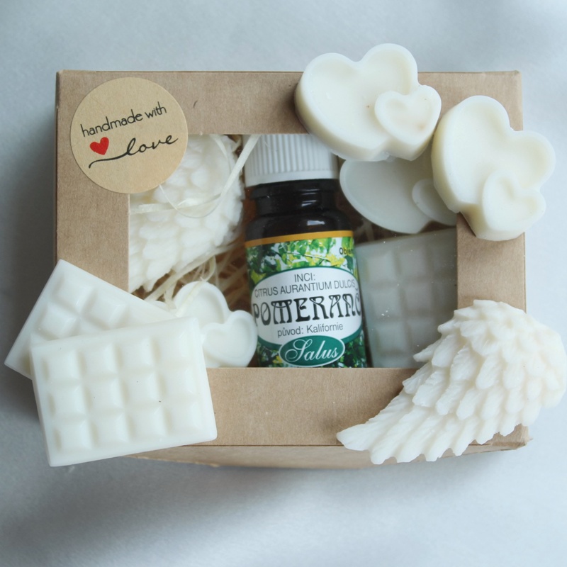 Dárkový balíček ručně odlévaných vosků do aromalampy ve tvaru křídla, dvou srdcí a tabulek čokolády z přírodního sójového vosku bez parfemace, doplněný o lahvičku 100% přírodního esenciálního oleje Pomeranč od firmy Saloos. Baleno v papírové krabičce s průhledem, v přírodní barvě, s dřevitou vlnou.