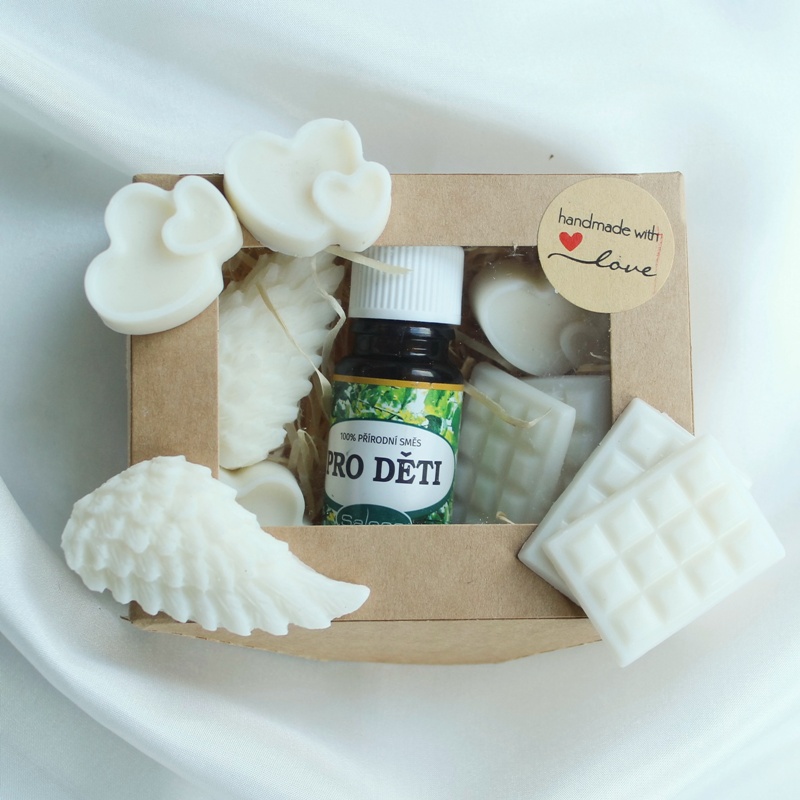 Dárkový balíček ručně odlévaných vosků do aromalampy ve tvaru křídla, dvou srdcí a tabulek čokolády z přírodního sójového vosku bez parfemace, doplněný o lahvičku 100% přírodního směs esenciálních olejů Pro děti od firmy Saloos. Baleno v papírové krabičce s průhledem, v přírodní barvě, s dřevitou vlnou.